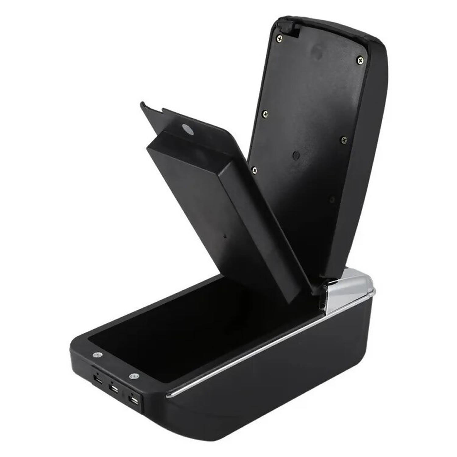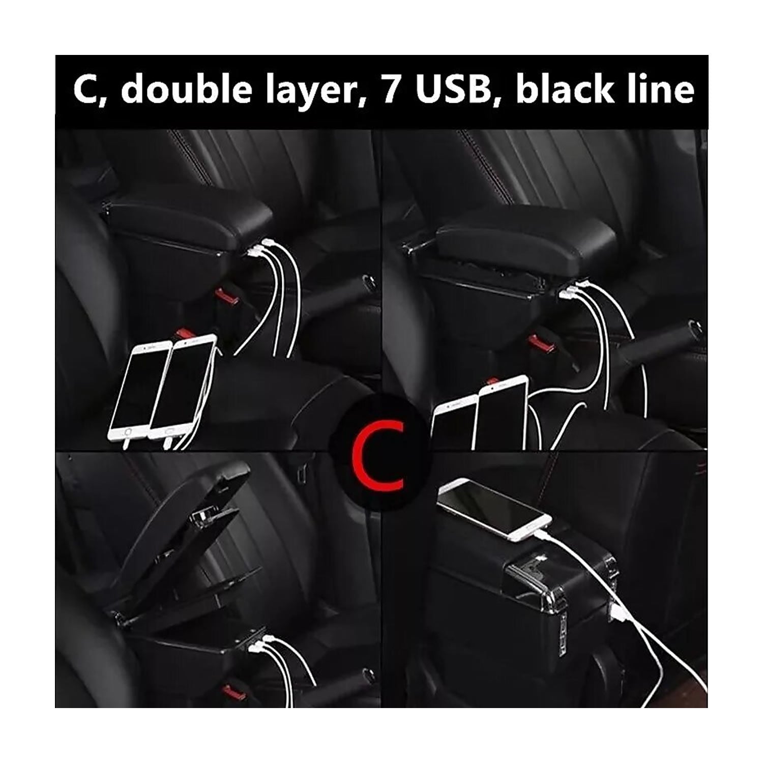 Este producto es adecuado para la mayoría de los automóviles, fácil instalación sin perforaciones, no solo una caja de almacenamiento en el automóvil, sino también un reposabrazos en el automóvil. Tiene 7 entradas USB para cargar sus dispositivos (Tiene 7 entradas pero una entrada USB se usa para alimentarlo con un adaptador que se coloca al encendedor de su auto), cenicero, base extensible y un compartimiento adentro con arto espacio.
