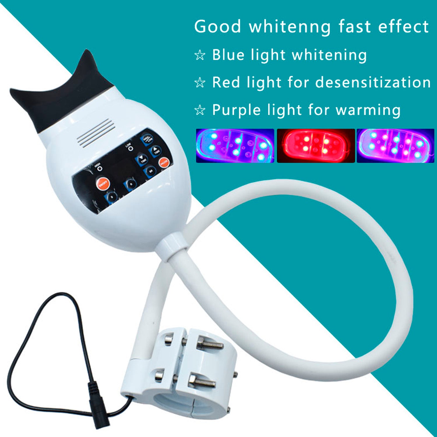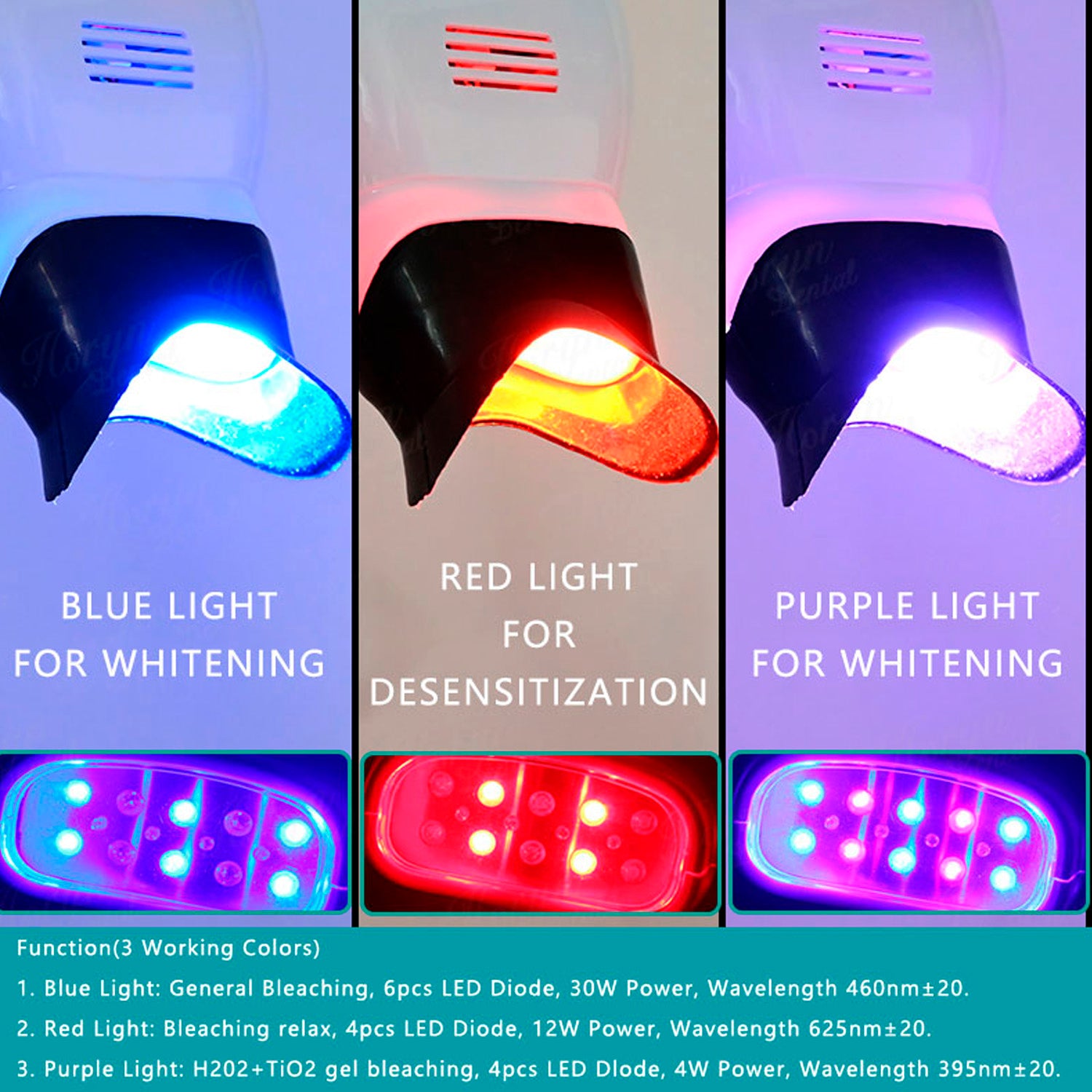Hay tres modos de luz: luz azul; luz púrpura; luz roja. La luz azul es para acelerar la descomposición del gel. Luz púrpura, algunos de los dientes especiales blanqueadores gel necesitan la luz púrpura. La luz roja puede aumentar la actividad de las células, promover el metabolismo celular, acelerar la circulación sanguínea, para eliminar el efecto de la inflamación del tratamiento.