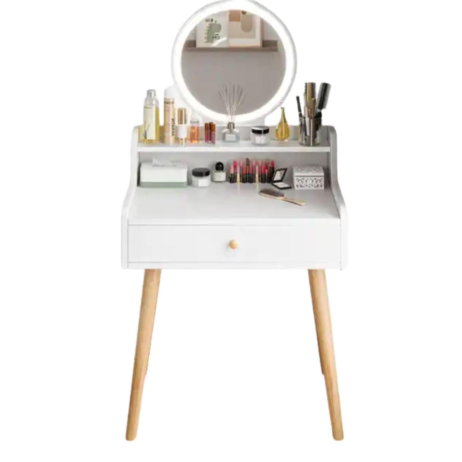 Agrega funcionalidad y estilo a tu dormitorio con el Tocador c/Espejo y cajon 60cm Chic Home, que incluye espejo y un cajón amplio. Ideal para organizar tus cosméticos, perfumes y accesorios en un solo lugar.