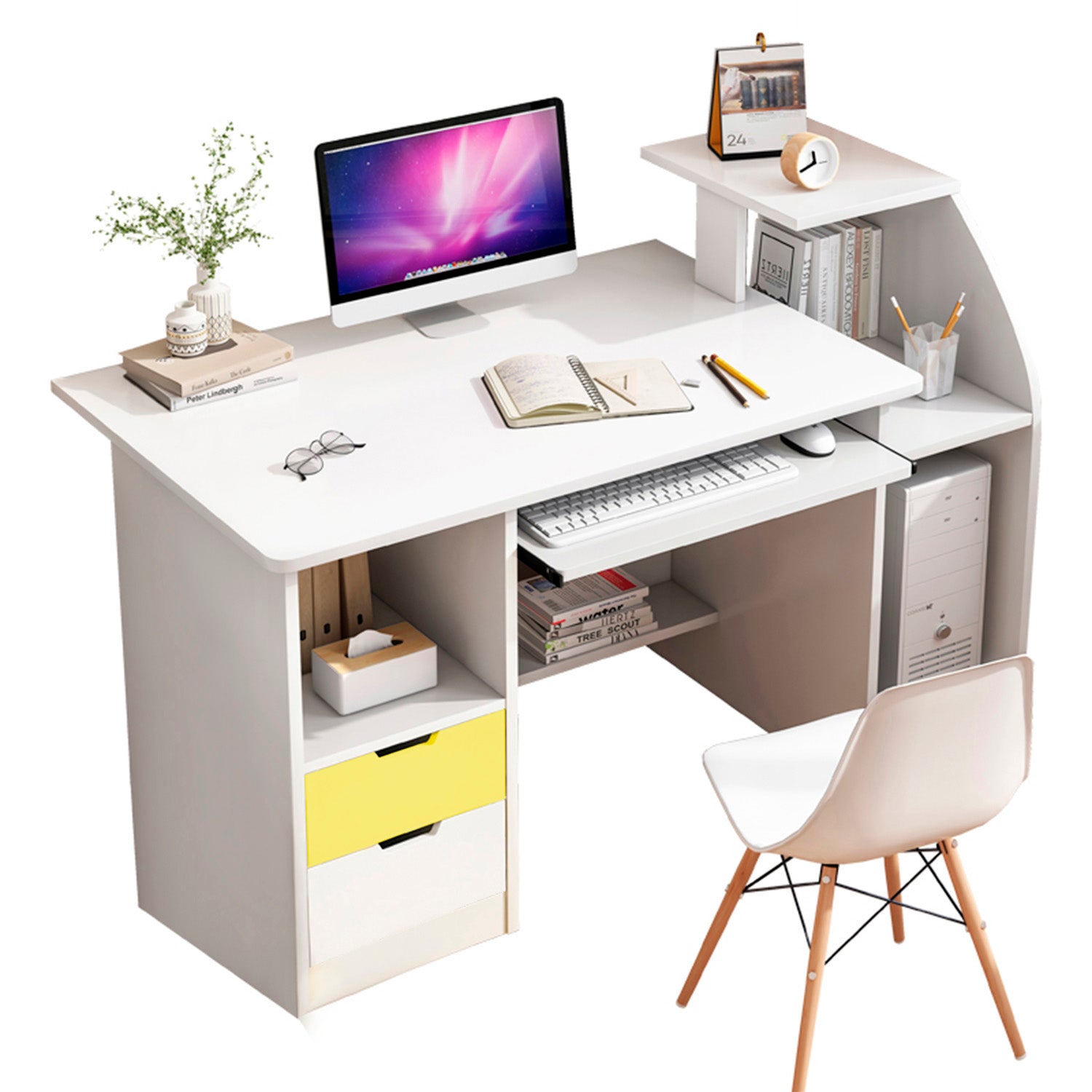 Un escritorio blanco con cajones para computadora de escritorio es lo que necesita para integrar diferentes objetos dentro de un espacio reducido, armonizando todos sus componentes con cajones extras para almacenar archivos o documentos importantes, estantes para recopilar, integrar decoraciones con un color blanco cálido perfecto para dar una sensación de pulcritud y orden.