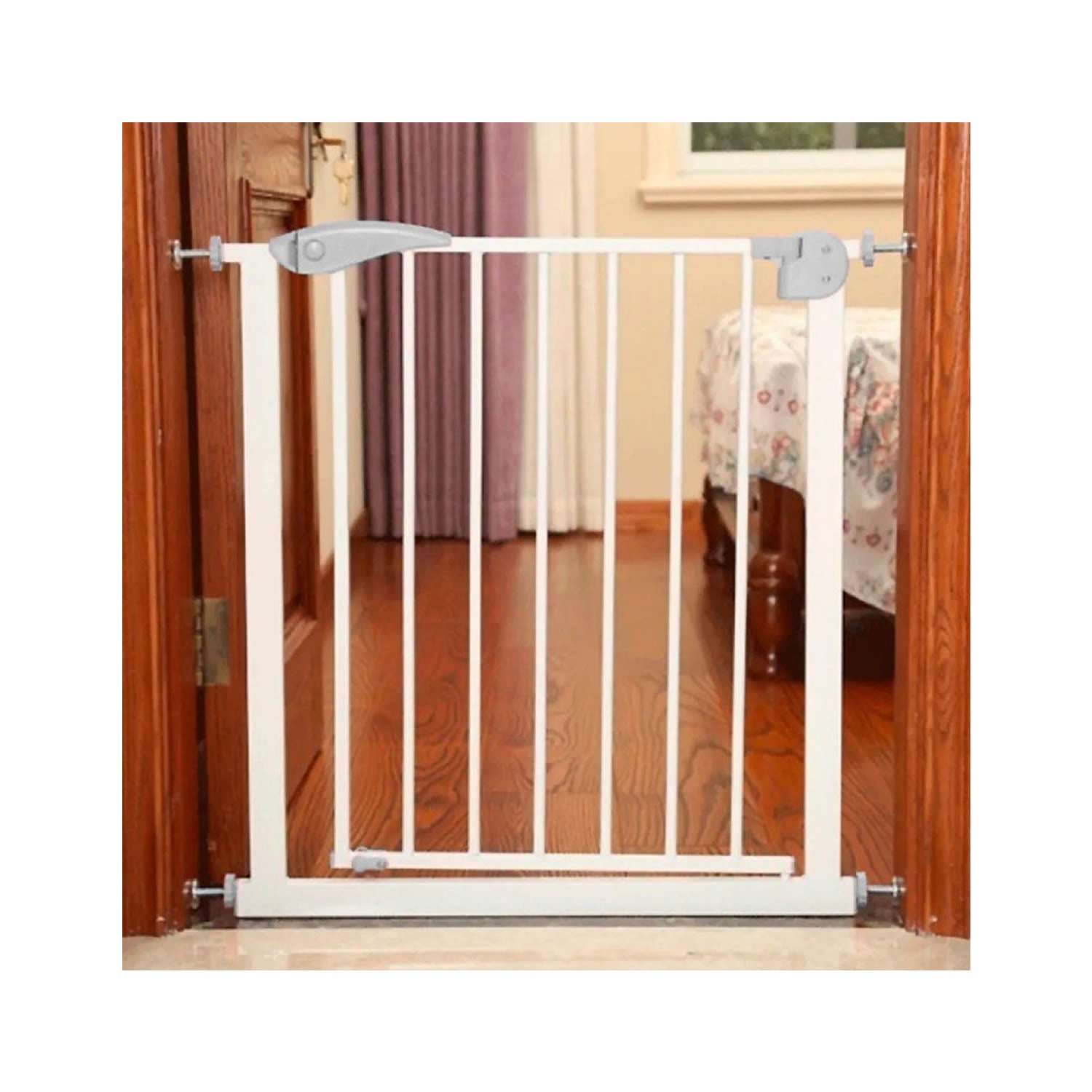 - Ajustable: El espacio inicial de las piezas laterales desaparecerá a medida que ajuste los tornillos de fijación en las paredes laterales del lugar de instalación. Ajustable y sólido. La estructura del marco de hierro bloquea la puerta de forma segura con una manija accionada por resorte y el montaje a presión no daña la pared. No se requiere taladrar para la instalación. Absolutamente seguro para los niños. Montaje muy rápido.