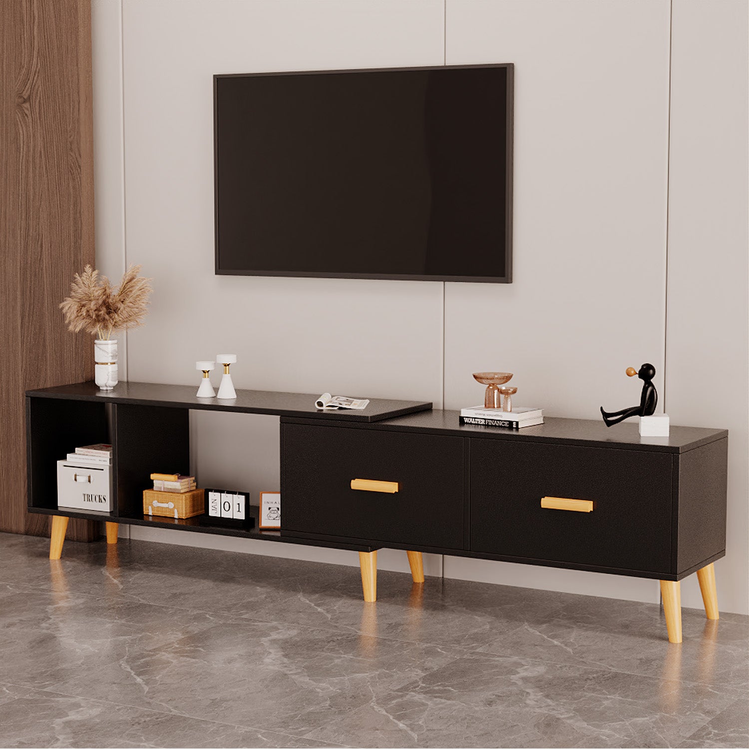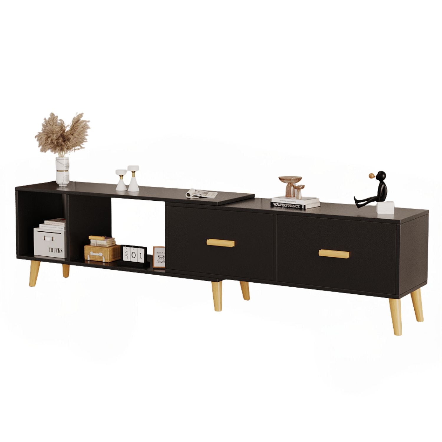 Dimensiones ideales: mide 30 cm de largo x 120 cm extendible a 198 cm de ancho x 40 cm de alto, el moderno soporte de TV está diseñado para soportar la mayoría de televisores de pantalla plana. Su estructura compacta pero robusta ofrece una gran estabilidad, por lo que es adecuada para salas de estar, dormitorios y salas de estar.