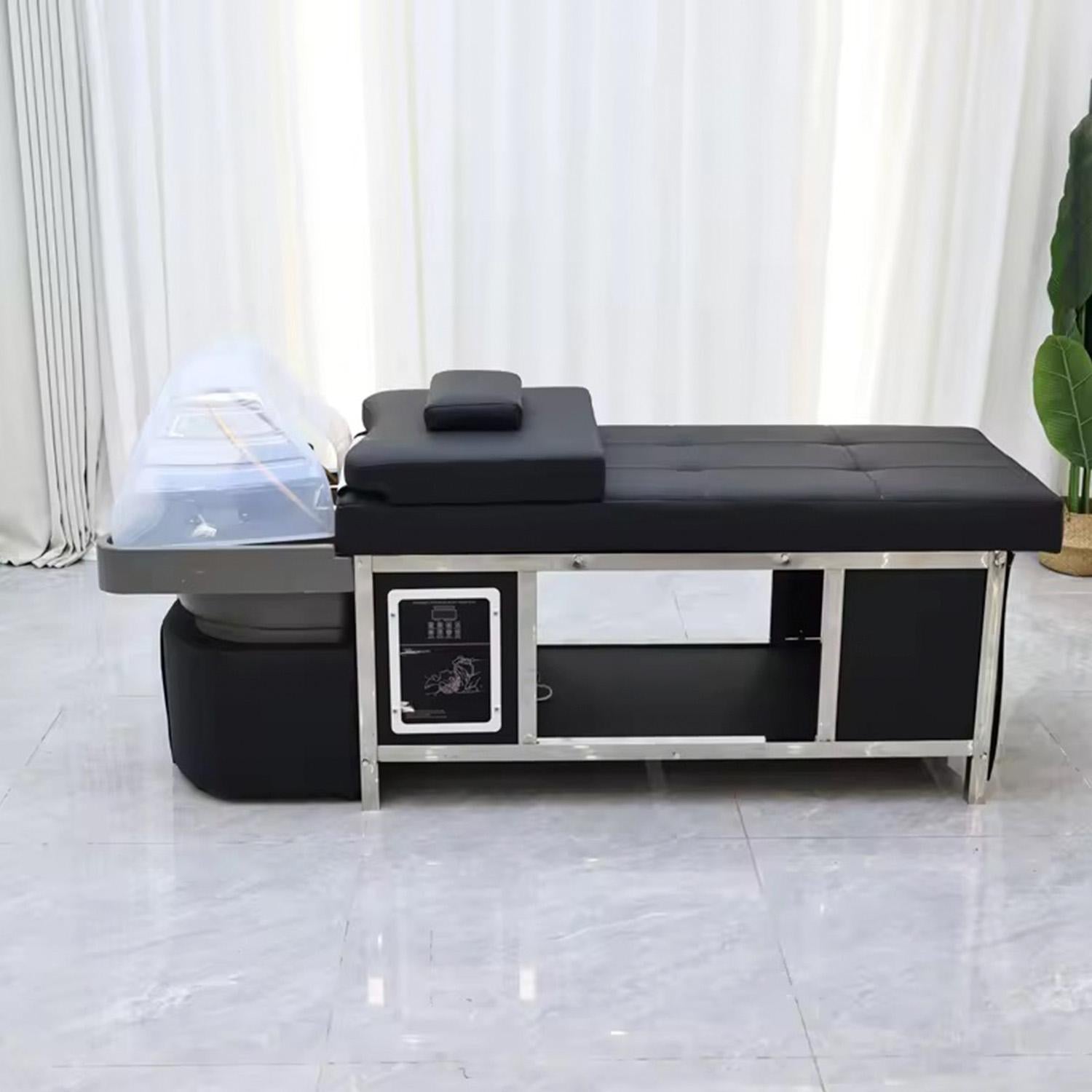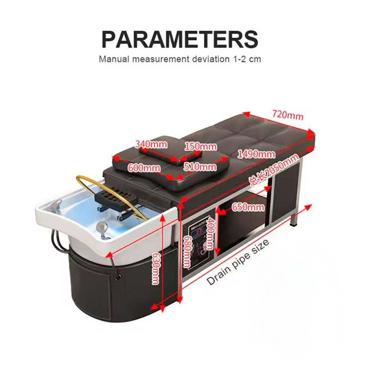 La camilla de masaje japones para cabeza, es una camilla de tratamiento completa, diseñada para servicios avanzados de cuidado del cuero cabelludo y el cabello. Con circulación de halo de agua, compatibilidad con vapor y terapia de luz LED, esta unidad ofrece una experiencia multisensorial profundamente relajante. Las placas de piedras calientes extraíbles y la función de calentamiento suave ayudan a liberar la tensión y a optimizar los resultados. Equipada con un lavabo de cerámica para champú y un suave acolchado de cuero sintético, esta camilla también incluye herramientas esenciales como un taburete para técnico, un fumigador, un gorro de fumigación y un cojín de masaje para la cabeza, para facilitar tratamientos profesionales y sin complicaciones de principio a fin.