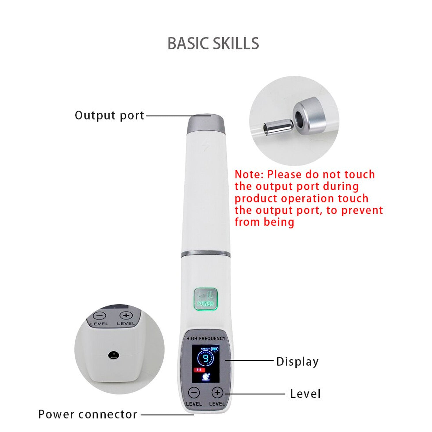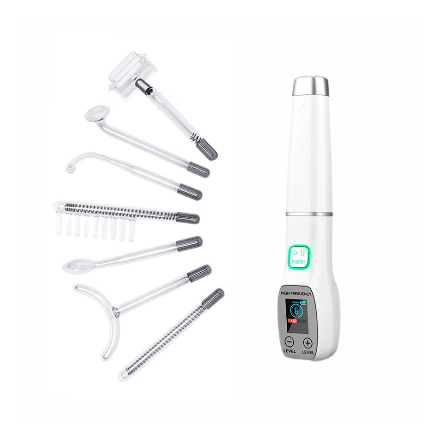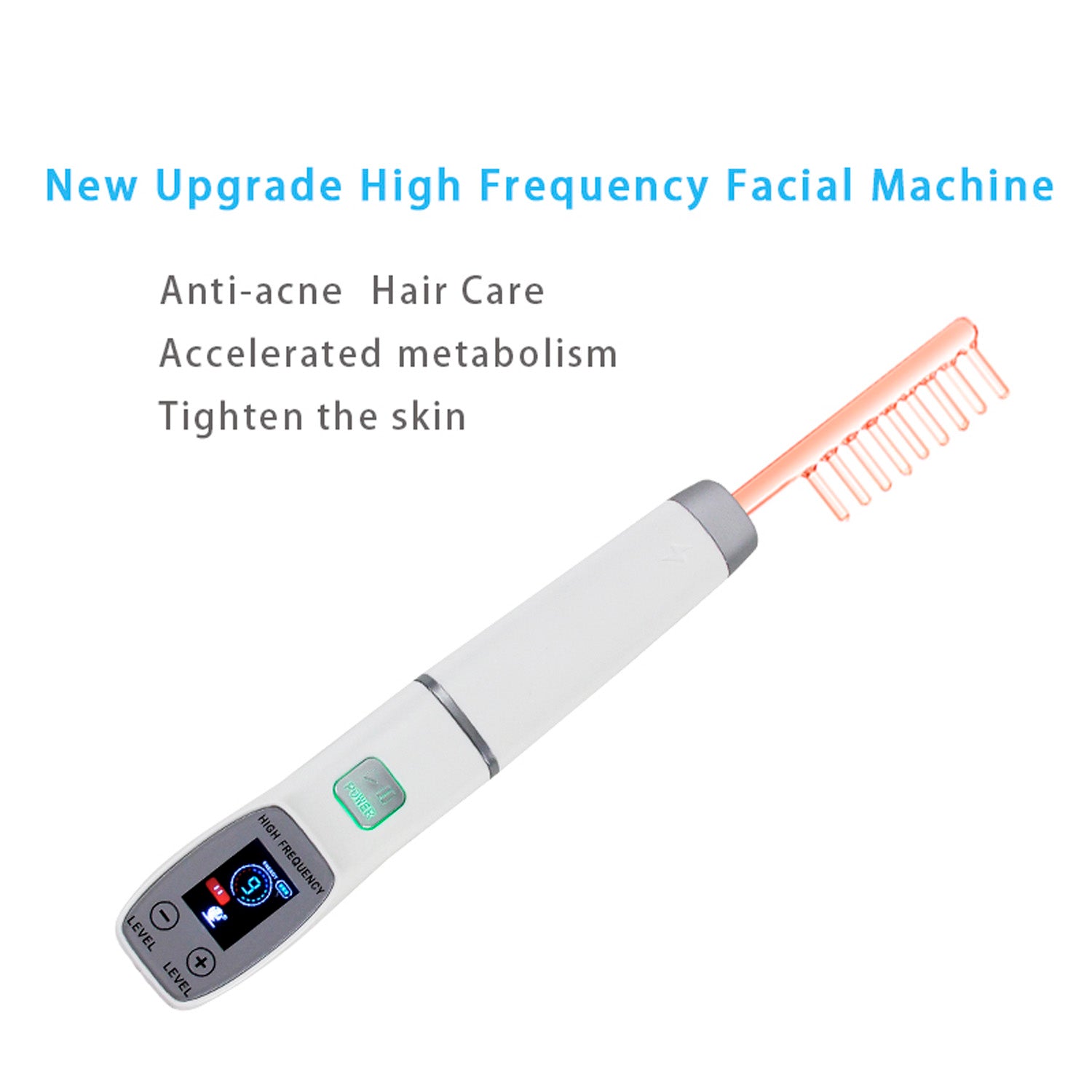 Máquina portátil de alta frecuencia a través del nuevo tubo de electrodo de vidrio de fusión (+ Ne) para producir corriente de alta frecuencia, acelera la circulación sanguínea y el metabolismo para el tratamiento antiacné y promueve la curación del acné, reduce las arrugas y tensa la piel, previene la caída del cabello y estimula el crecimiento de cabello nuevo.