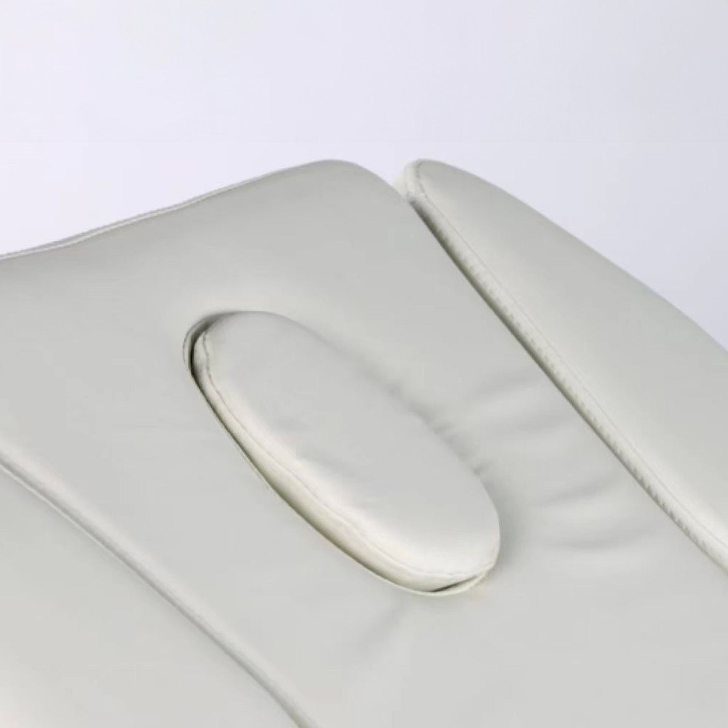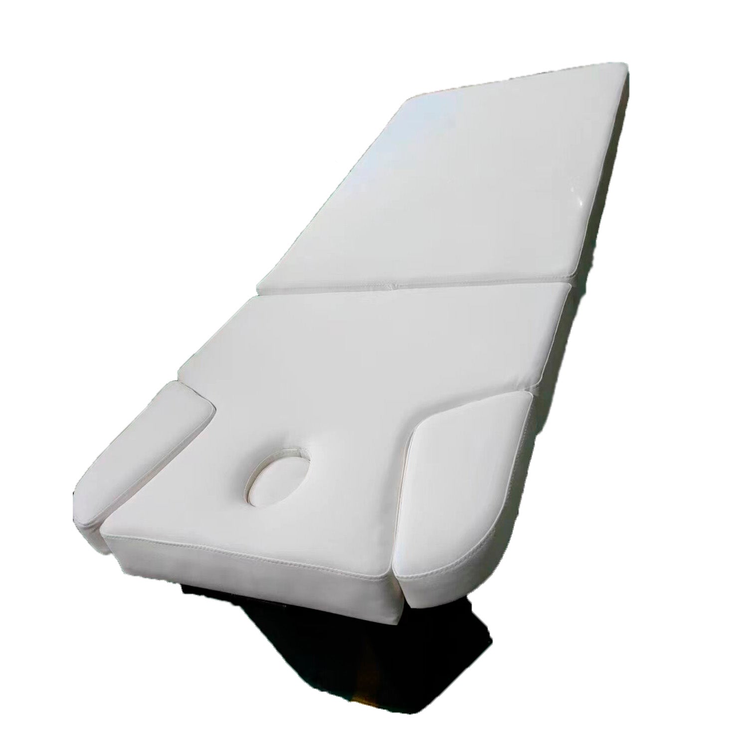El respaldo de la camilla cuenta con un agujero y tapón facial, lo que permite que los clientes disfruten de sus tratamientos cómodamente mientras están acostados boca abajo. Además, gracias a su sistema regulable mediante un motor eléctrico, es posible ajustar el ángulo del respaldo desde 0° hasta 70°, brindando versatilidad y comodidad.