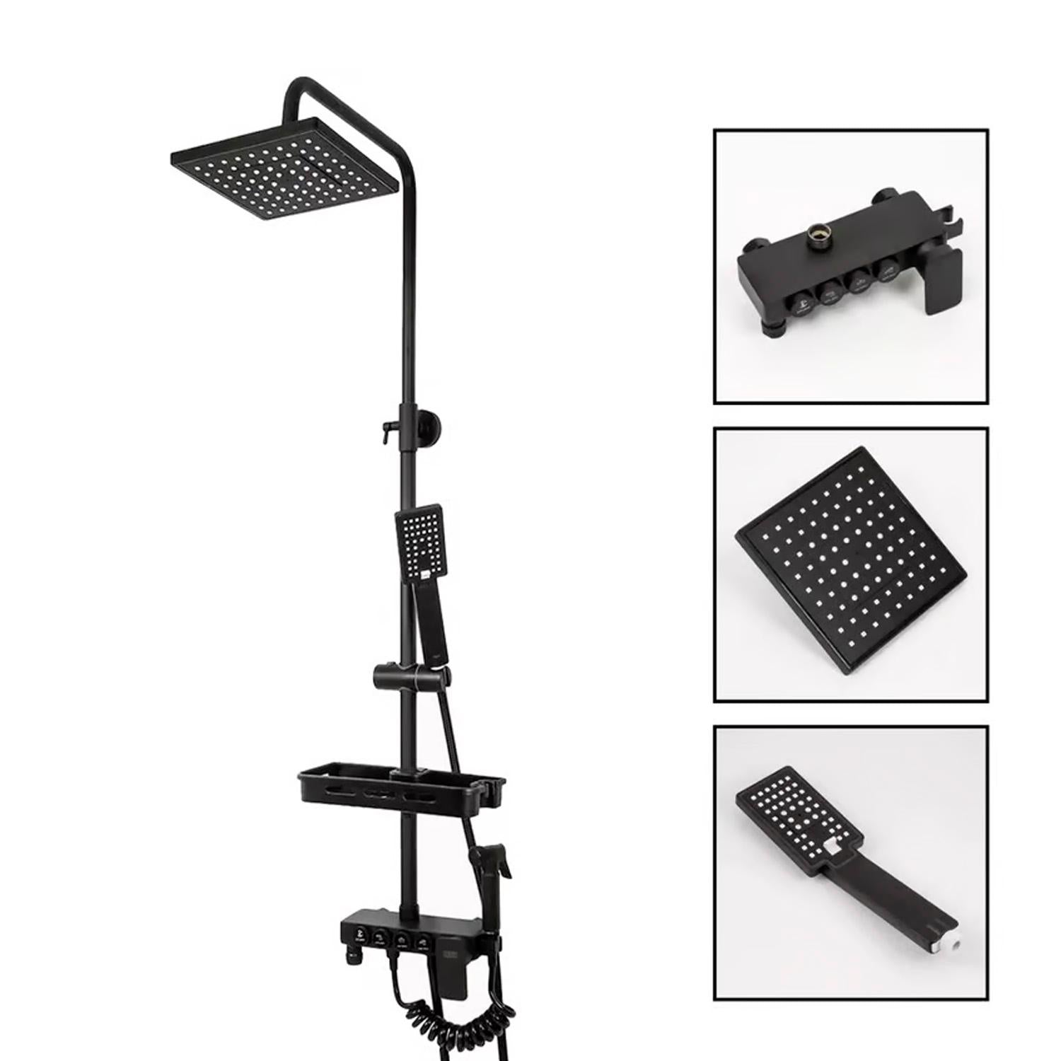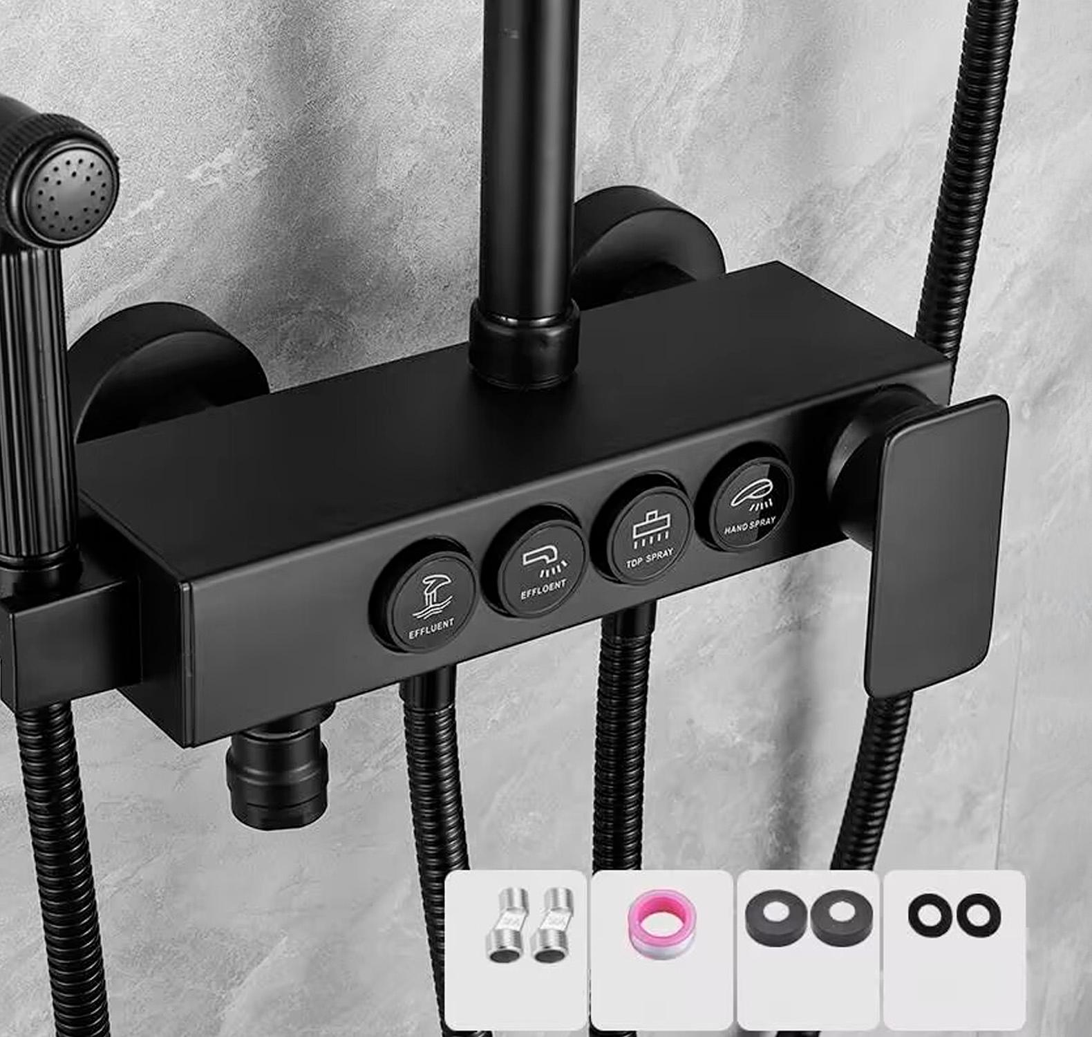 La ducha superior puede ajustarse 360 grados, el soporte de la ducha de mano es ajustable, y la boquilla de silicona suave es fácil de limpiar. La altura de la barra de la ducha es de 65-110 cm y se puede ajustar. DUCHA TIPO LLUVIA: La ducha superior crea una sensación de lluvia sobre las personas, brindándote un masaje corporal completo. El panel de ducha cuenta con un cabezal de ducha tipo lluvia, un surtidor, una ducha de mano y un patrón de jets corporales. Se incluye el montaje de fontanería para una fácil instalación. Material del sistema de ducha: Diseño de soporte oculto, le da un aspecto moderno y limpio.