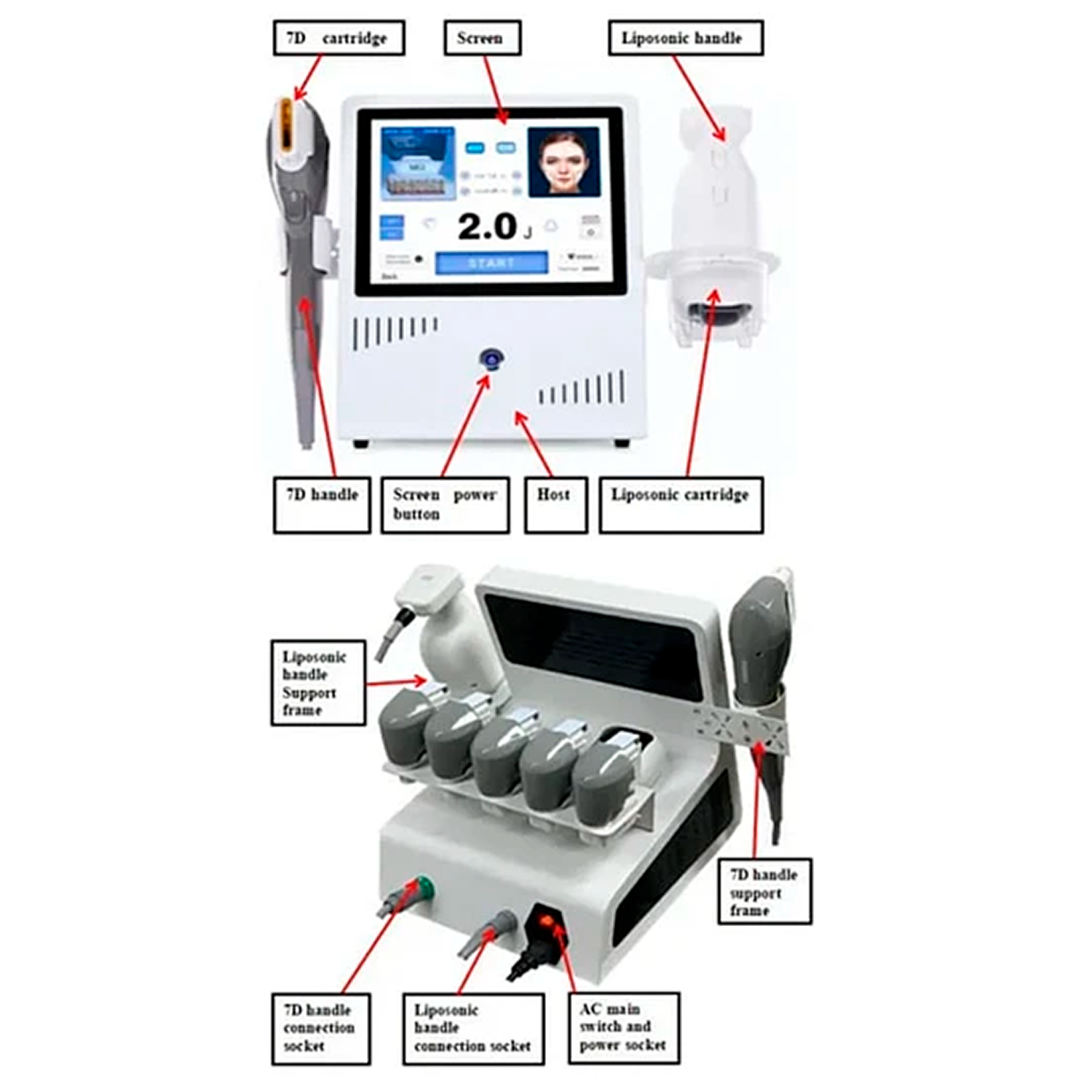 Con 7 cartuchos diferentes, el ultrasonido enfocado de alta intensidad (HIFU) entrega con precisión energía térmica (65 ℃ - 75 ℃) en las capas diferentes profundidades del tejido para estimular la regeneración de colágeno con el fin de aumentar la elasticidad de la piel, mejorar la textura de la piel y reducir la flacidez.