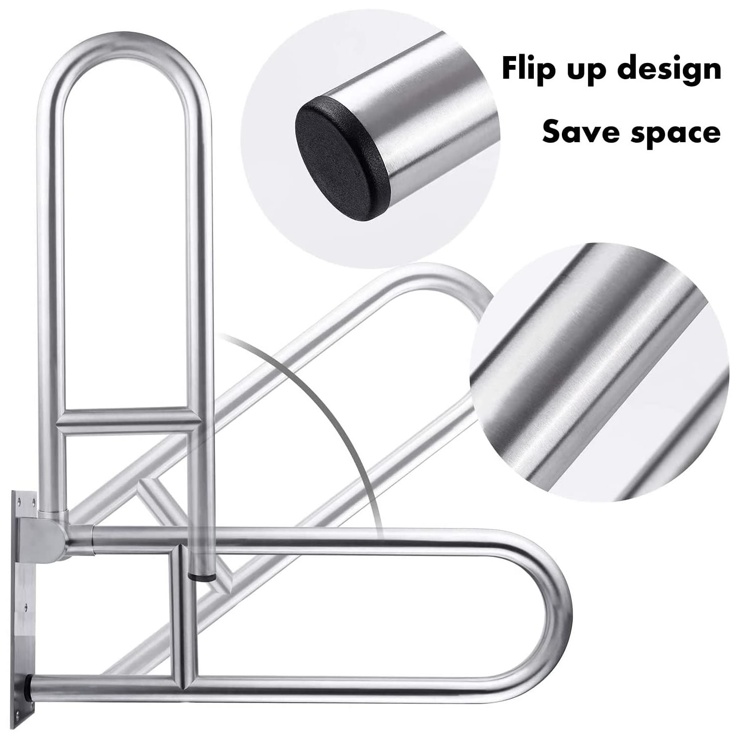 La barra abatible plegable se puede girar 90 grados verticalmente, fácil de voltear y soltar, se almacena cómodamente fuera del camino cuando no es necesario, ahorra espacio. Tamaño: 23.622 x 10.236 x 3.150 in, lo que hace que sea una buena opción para baños pequeños o espacios reducidos.