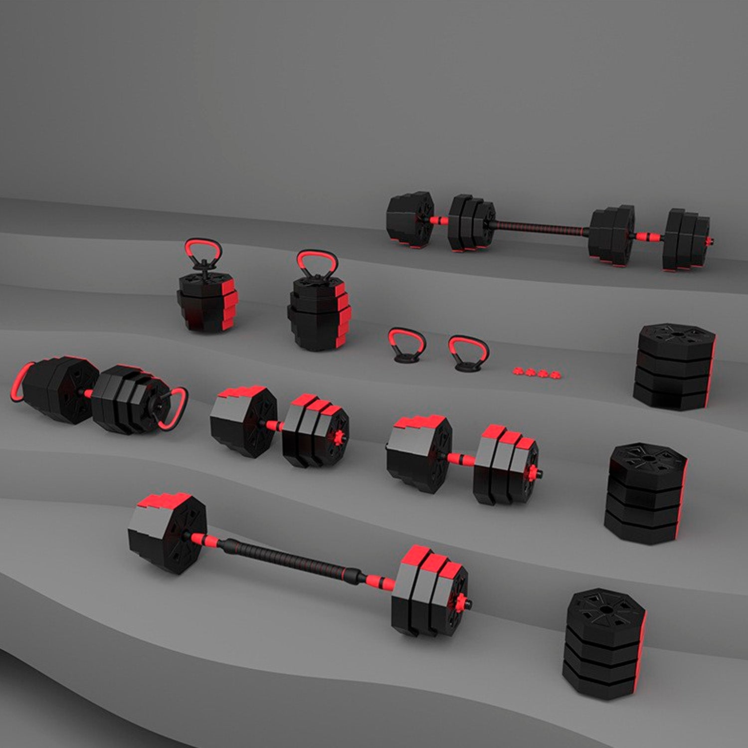 Set multifuncional de mancuernas, kettlebell y barra que puedes usar en cuatro configuraciones para personalizar tu entrenamiento al máximo: mancuernas, kettlebell, barra ligera y barra pesada.
