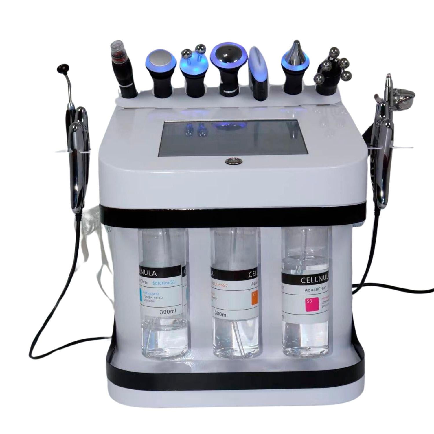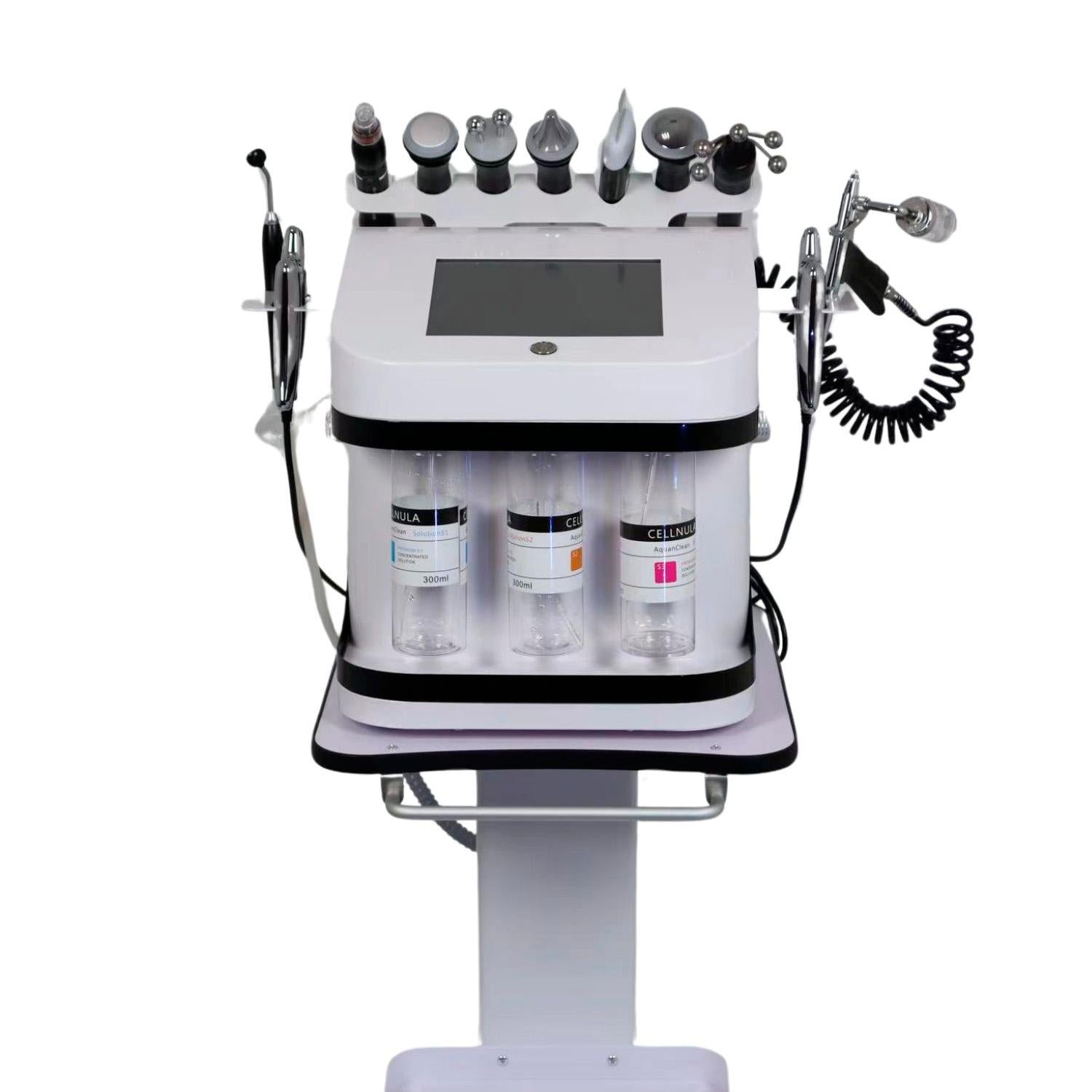 Máquina de Hidrodermoabrasión 10 en 1 es una nueva tecnología que combina la eficacia de un sistema de vacío y este nuevo sistema aporta distintos activos en la piel. Es mucho más suave que la microdermoabrasión o punta de diamante, ya que solo se usa el aporte agua, La principal ventaja de los equipos de Hidrodermoabrasión es la diversificación del tratamiento con el uso de productos para el cuidado de la piel.