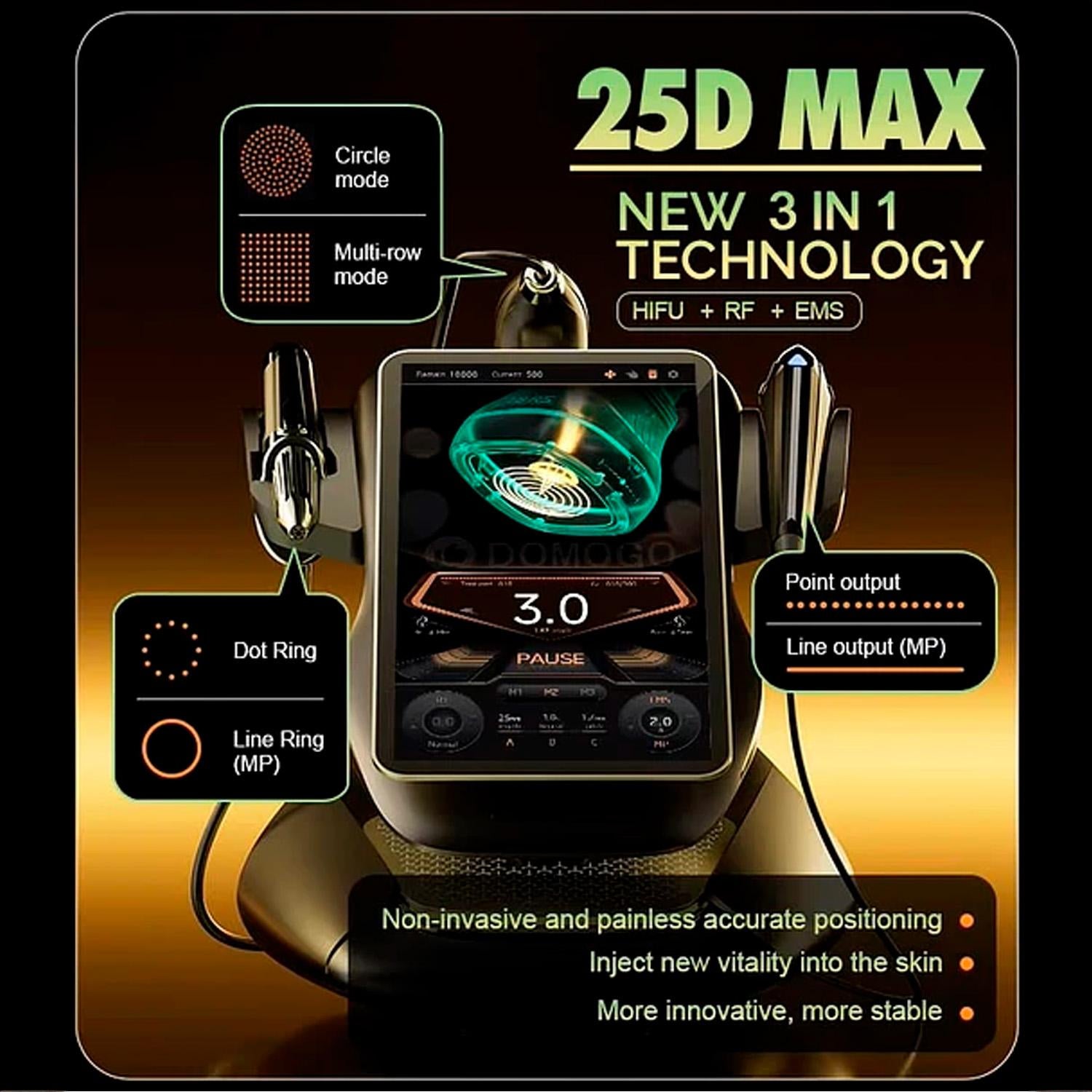 El nuevo equipo de belleza HIFU 360 Max o 25D Max, Incorpora y combina tres tecnologías principales: Ultrasonido enfocado de alta intensidad (HIFU), UltraBooster y Liposonix RF corporal. Esta nueva combinación, ofrece potentes resultados en antienvejecimiento, mejorando la tonicidad o elasticidad de la piel al igual que la mejoría del contorno corporal con un tratamiento no invasivo.