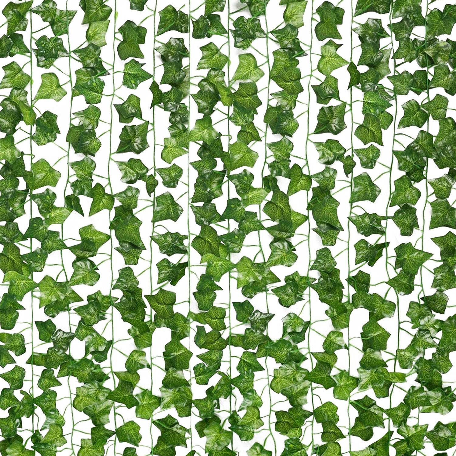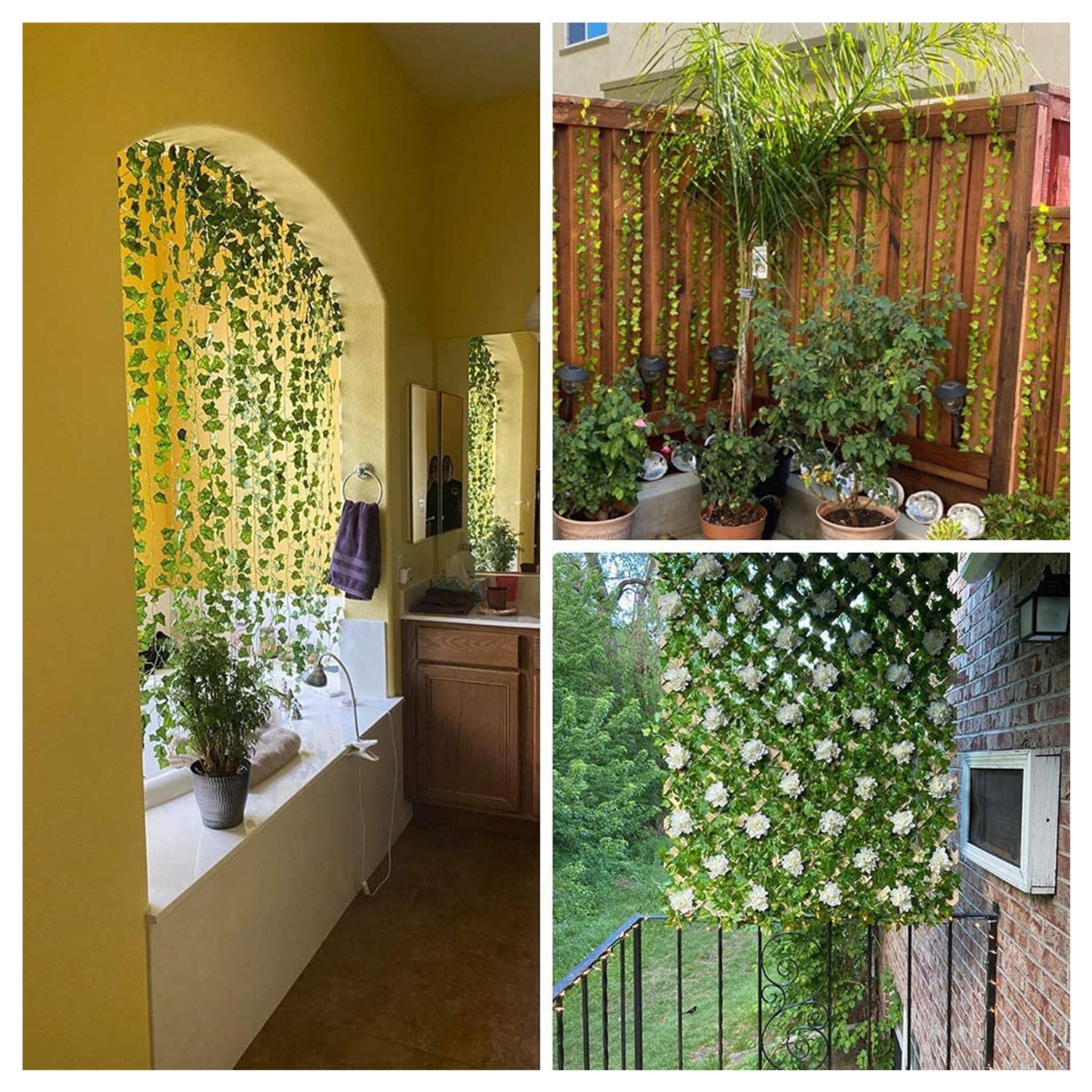- Decoración ideal para interiores y exteriores: Adecuado para el hogar. Es adecuado para uso en exteriores, decoración de fiestas y bodas al aire libre, las hojas artificiales son impermeables y protectoras solares. Las enredaderas de hiedra falsa se pueden unir fácilmente a cualquier superficie, como vallas, paredes, columnas o escaleras.