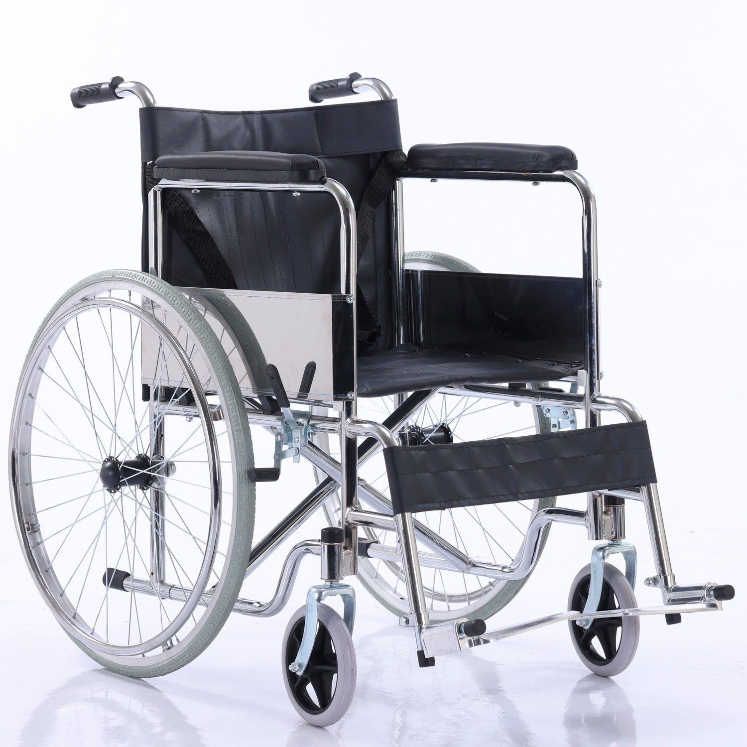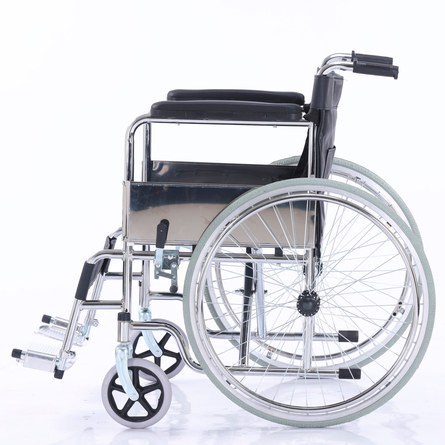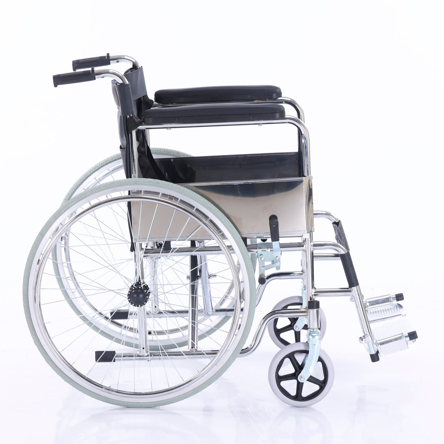 Esta silla de ruedas cromada ha sido fabricada con materiales de alta calidad que garantizan su durabilidad a largo plazo. La estructura de acero cromado ofrece resistencia y estabilidad, asegurando que la silla pueda soportar el uso diario y resistir el paso del tiempo.