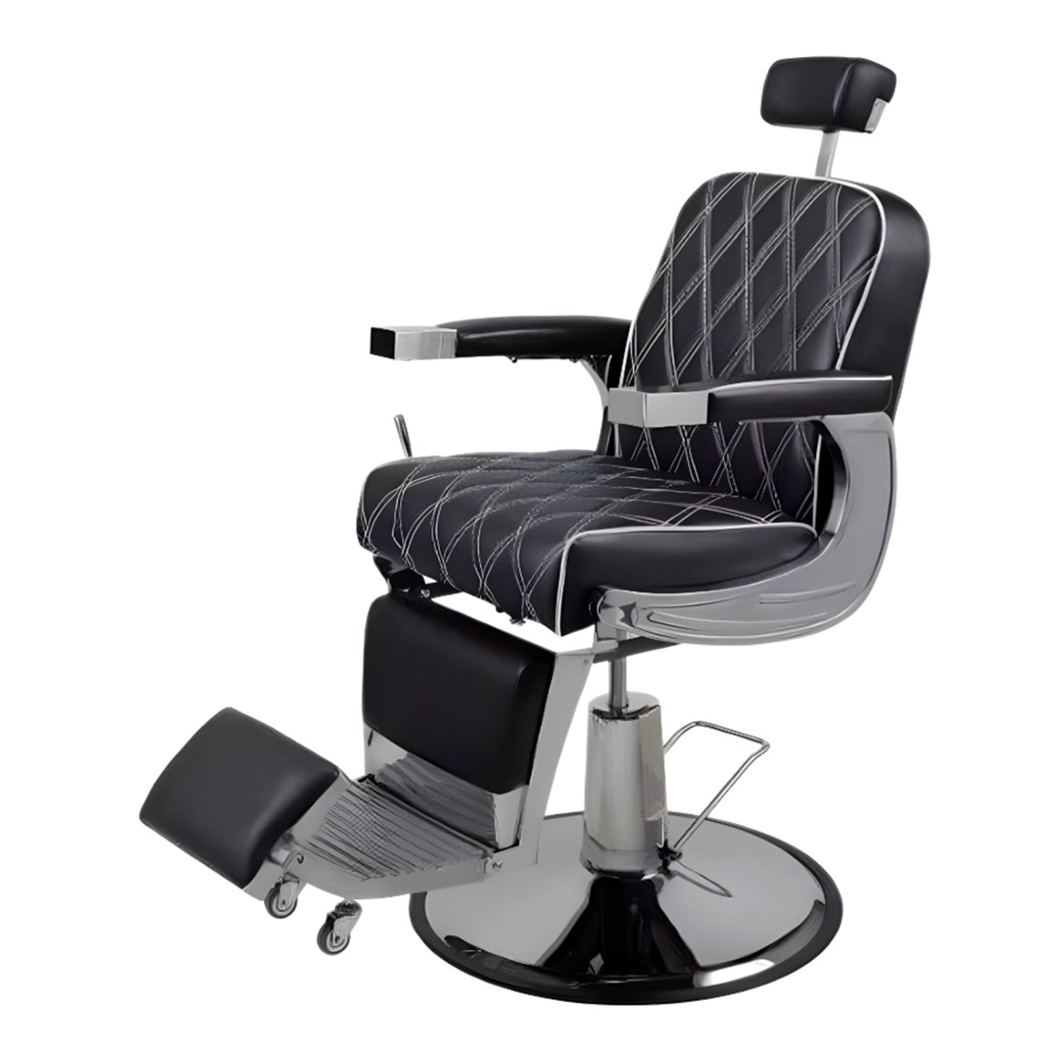 Sillón de Barbería Modelo American. Reclinable y de altura ajustable, el apoya cabeza se puede ajustar o retirar. Apoyabrazos metálico y de ecocuero, apoya pies metálico. Ideal para salones de belleza, barberías y spa.
