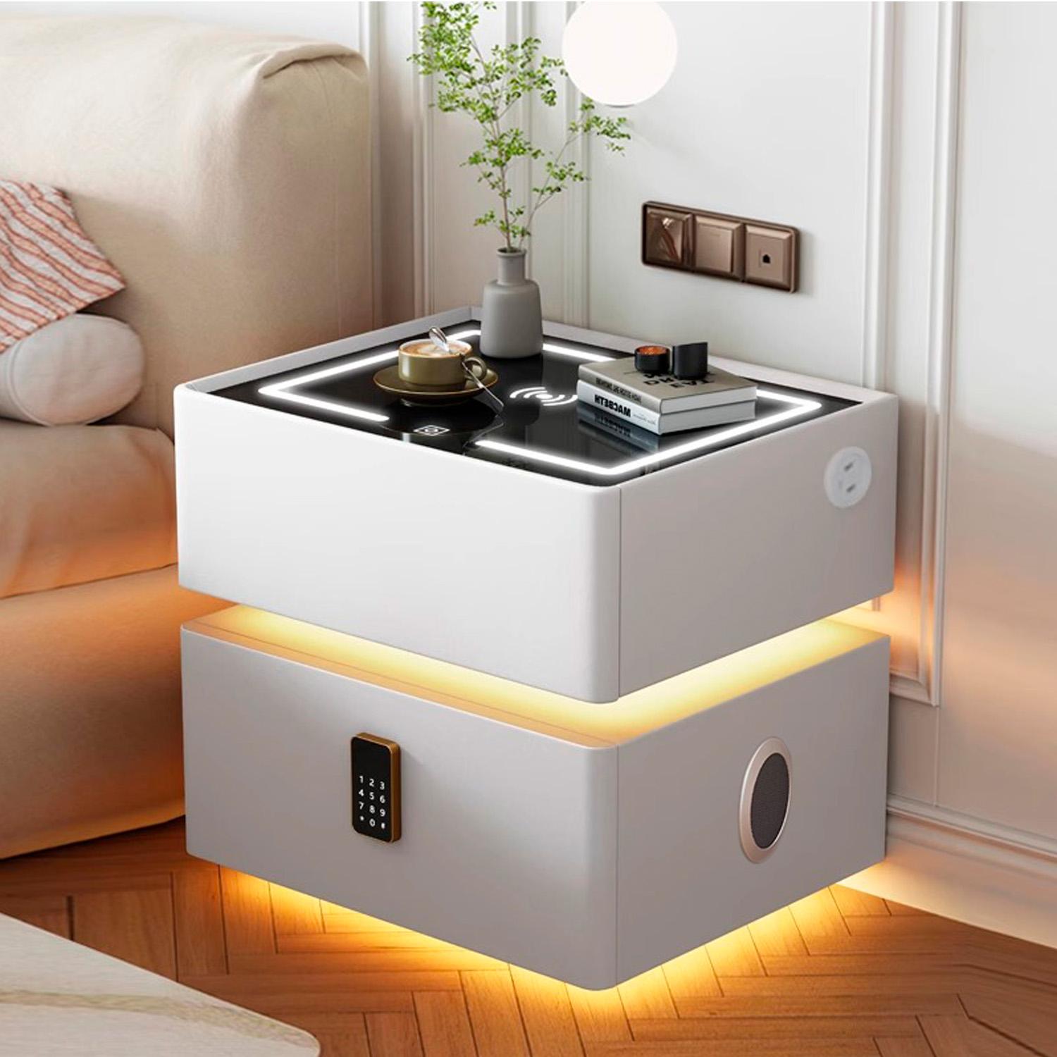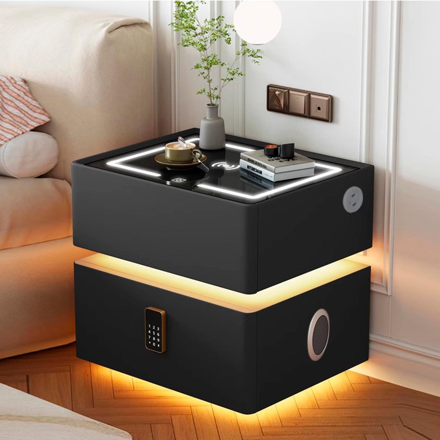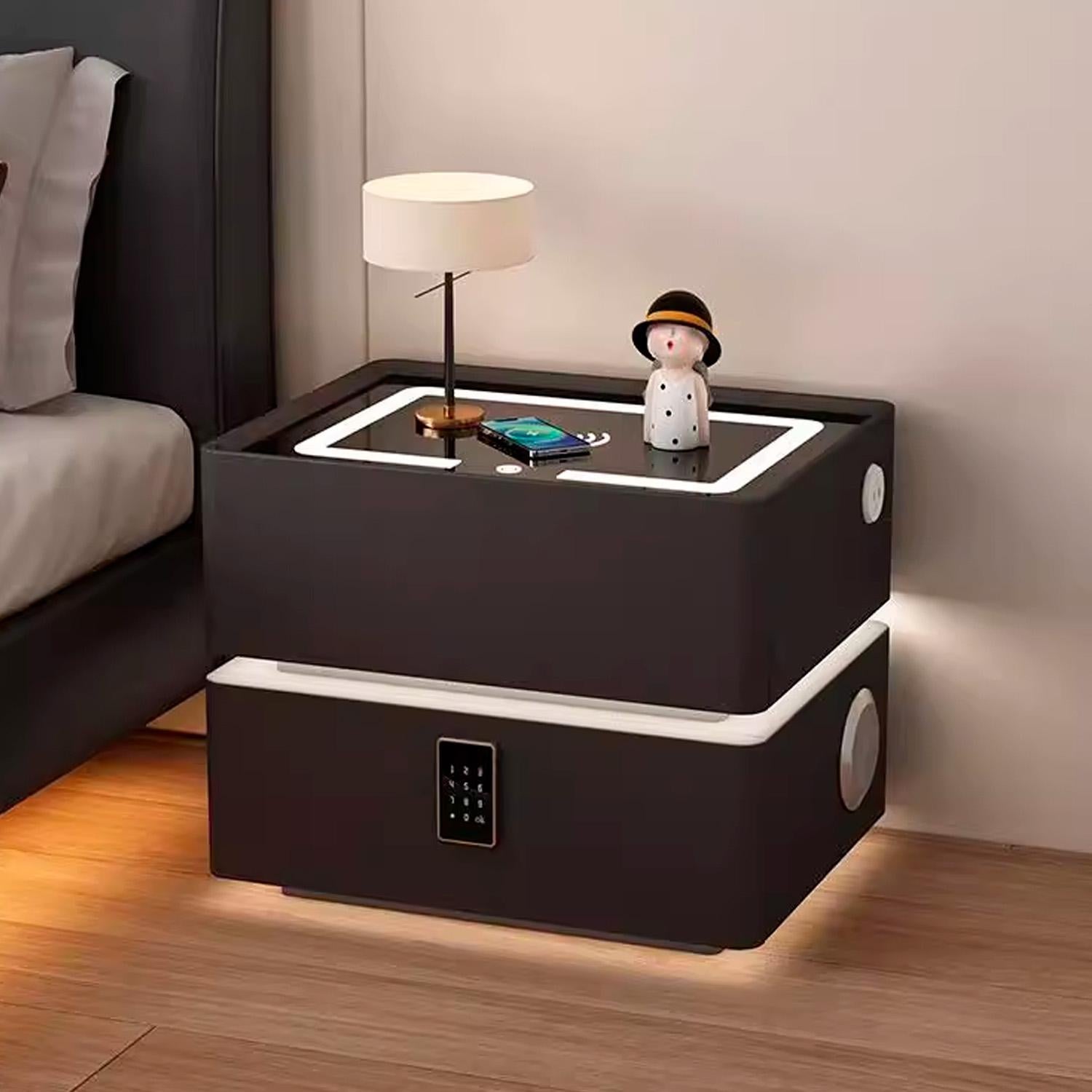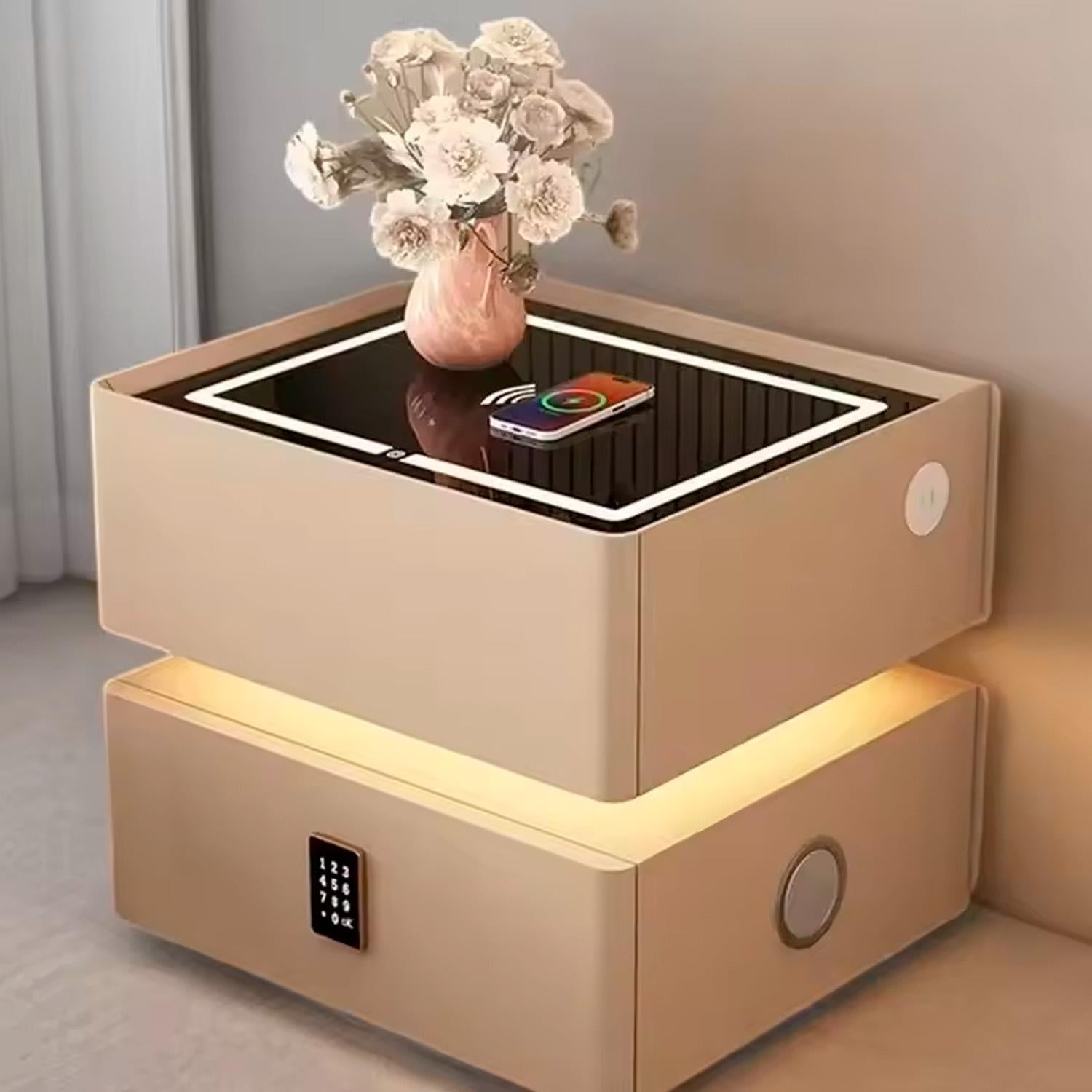 Esta mesita de noche inteligente combina funcionalidad y diseño moderno, con un cargador inalámbrico (15W), puerto de carga USB, bloqueo con contraseña, altavoz Bluetooth y luces LED táctiles en tres colores. Está hecha de madera con un revestimiento de cuero, admite personalización en tamaño y color, y es adecuada para dormitorios, hoteles, oficinas y más.