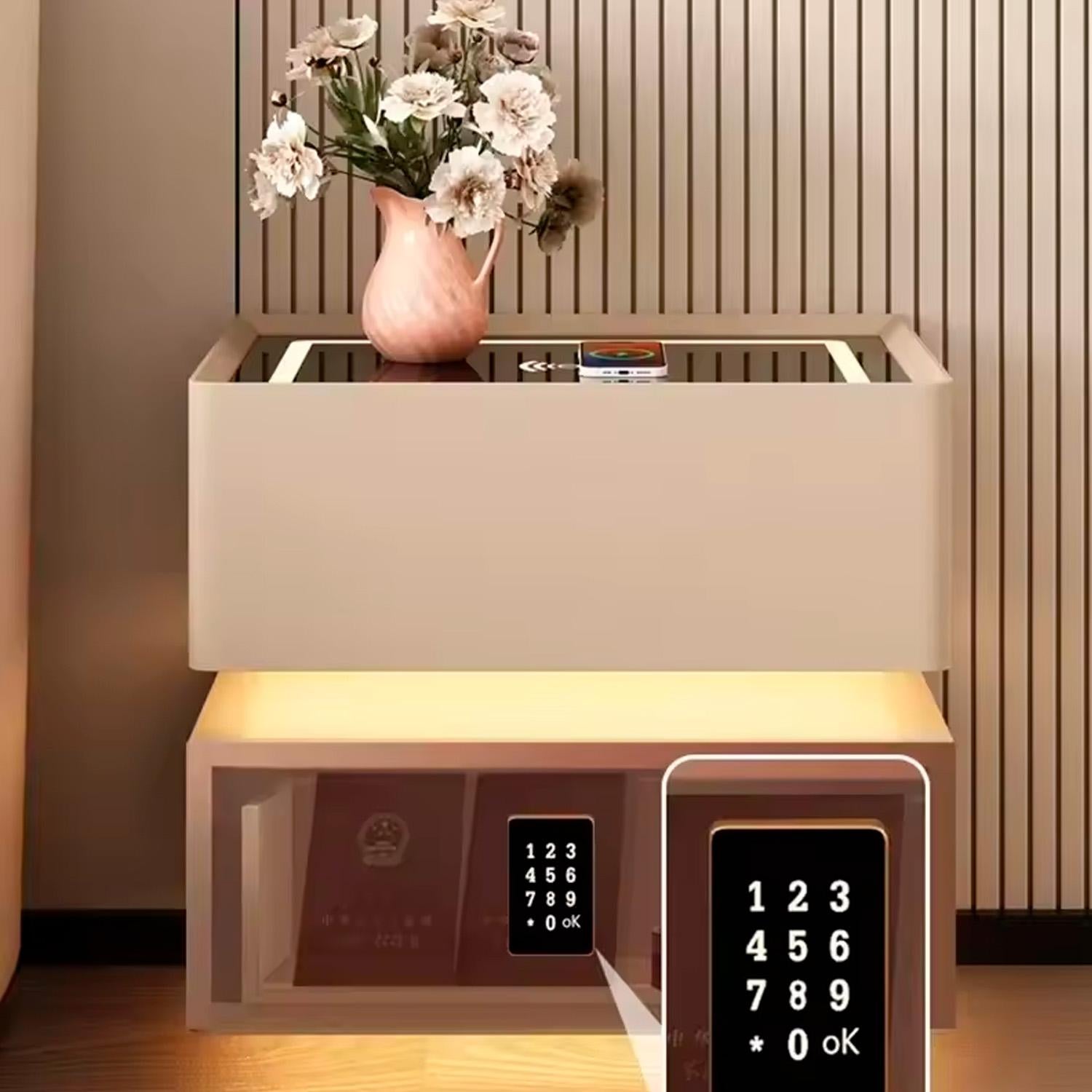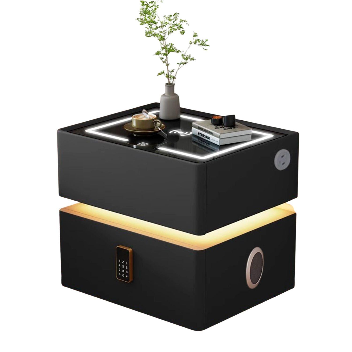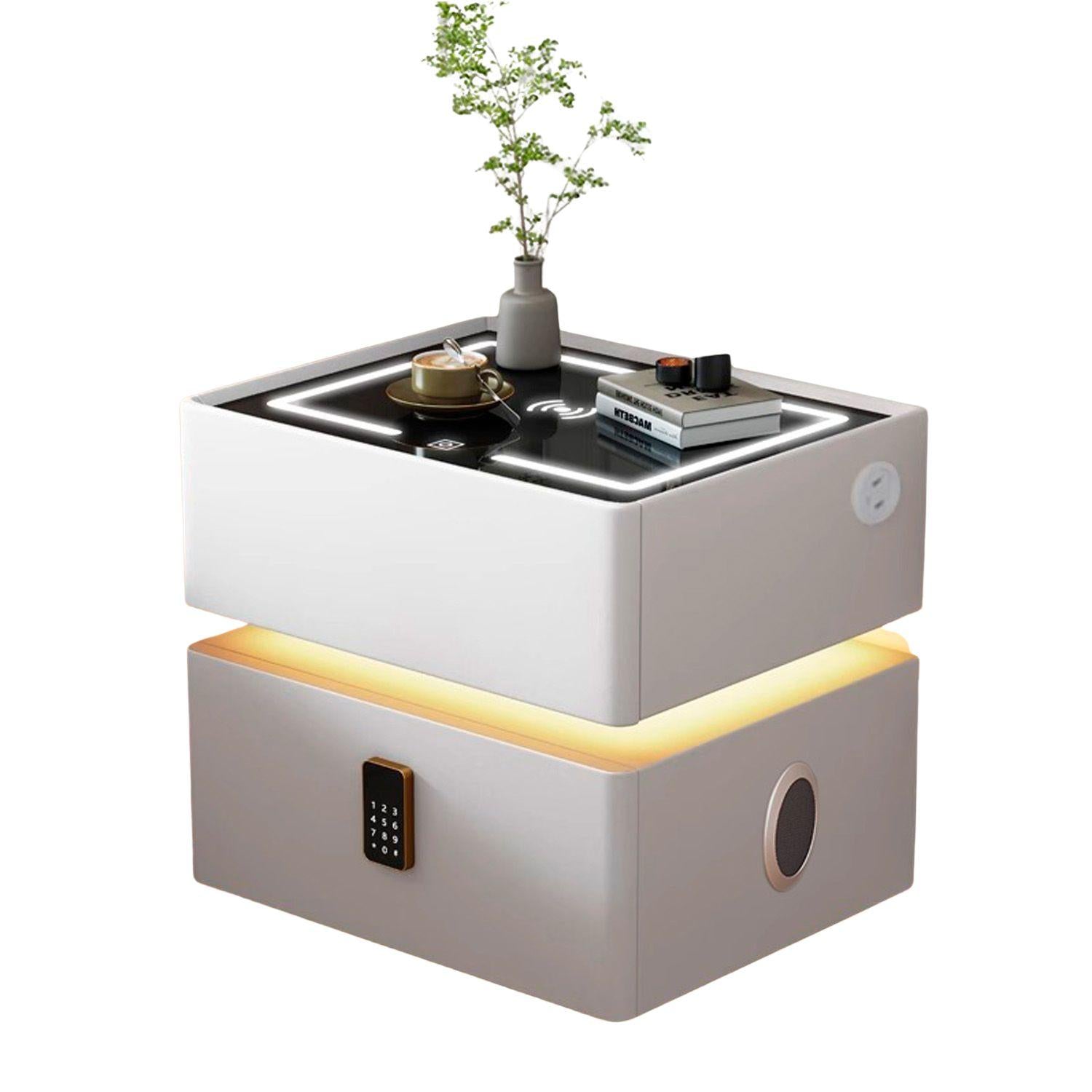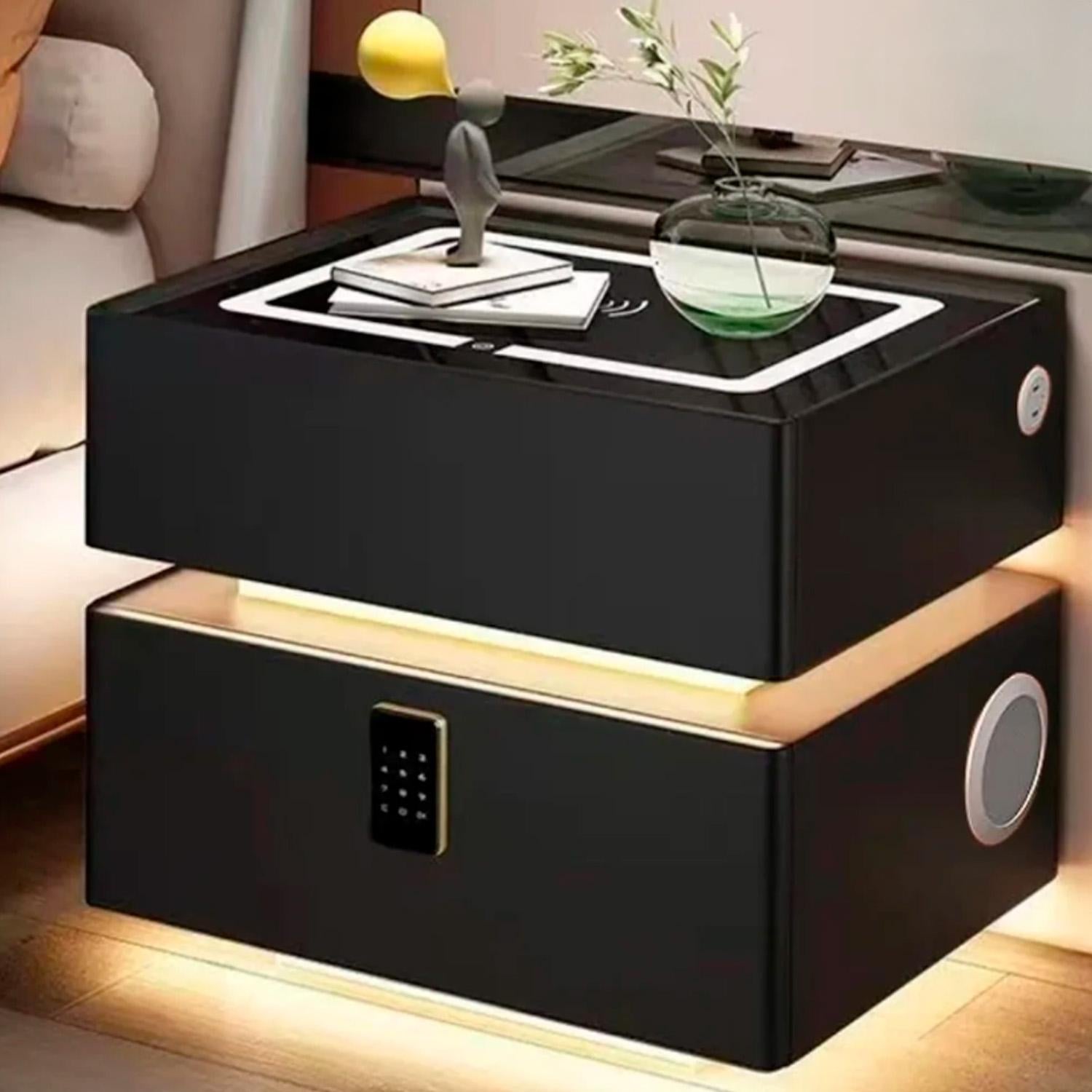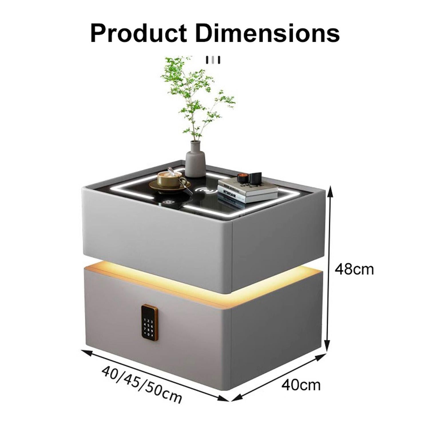 Esta mesita de noche inteligente combina funcionalidad y diseño moderno, con un cargador inalámbrico (15W), puerto de carga USB, bloqueo con contraseña, altavoz Bluetooth y luces LED táctiles en tres colores. Está hecha de madera con un revestimiento de cuero, admite personalización en tamaño y color, y es adecuada para dormitorios, hoteles, oficinas y más.